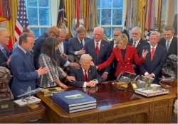Chacun aura vu ce cliché où Paula White, nommée par Trump II à la tête d’un « Bureau de la Foi à la Maison-Blanche », entourée d’une vingtaine de pasteurs « venus de tout le pays », bénit Donald Trump assis en son bureau ovale et prie pour que Dieu donne force au Président et fasse triompher les USA, nation placée under God, « sous l’autorité de Dieu », dans leur guerre contre l’Iran. Ailleurs on voit la télévangéliste prier, comme une pythie en fureur, que Dieu « frappe, frappe, frappe » l’ennemi !